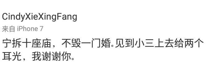 前几天谢杏芳和林丹还吻别来着。。。。今天谢杏芳就发微博说宁拆十座庙,不毁一门婚。见到小三上去给两个耳光,我谢谢你。。。。所以这是撕网友呢还是小三呢??