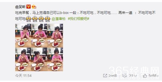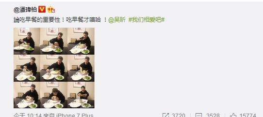 两人真是一言不合就虐狗呢,一大早起来就要让我们吃狗粮了。吴昕晒出一组照片,并配文已下,你们自己瞧瞧。看着照片的早餐真是要幸福死了,爱心早餐耶,哈哈。而潘玮柏也晒出一组早餐,真是甜死人。两人吃的甚是开心,而我们不知不觉吃了一把狗粮。真是够了两位,哄!