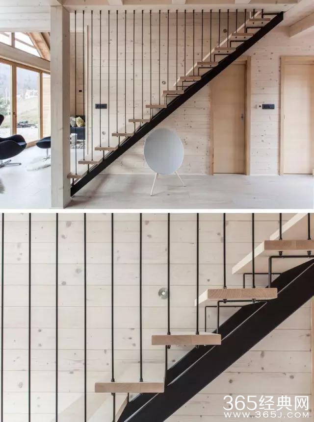 楼梯的设计也是黑色,黑色吊杆的排列醒目而又有韵律感。
