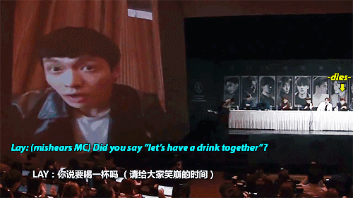 EXO记者会上,连线张艺兴主持人说:“下次10人一起见面”,小绵羊听了后说:“你说要喝一杯吗?”。台上的成员纷纷拍桌大笑起来,右边那位却笑到摔倒了。看来小绵羊的搞笑功力不是一般的高。
