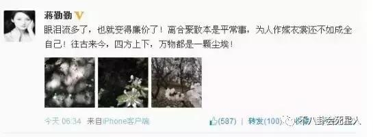 而戏外的蒋勤勤跟陈建斌的婚姻似乎也不是一帆风顺的,比如她这条微博一度被传成离婚宣言。
