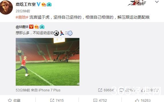 随后,鹿晗工作室也发了一条微博:流言猛于虎,坚持自己坚持的,相信自己相信的,解压跟运动更配哦!