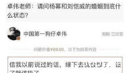 杨幂与刘恺威是在2014年1月8日在巴厘岛举行婚礼,宣布二人结婚。而且当时收获无数网友祝福与羡慕,可惜好景不长,没过多久二人就传出很多婚姻不和的消息,令人惊讶不已。虽然关于二者婚变的消息传的沸沸扬扬,可是却一直没有一个确切的消息,至今仍为一个谜!然而就在近日,号称"中国第一狗仔"的卓伟,在网上回答网友提问时,出人意料的透露出这个消息。