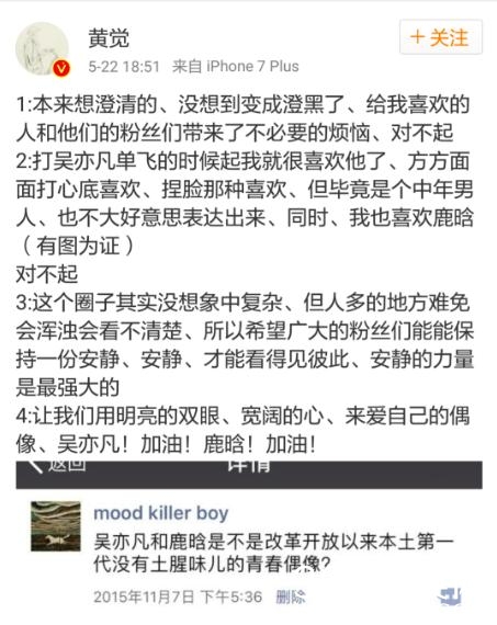 新浪娱乐讯 近日,黄觉因曾经对吴亦凡的发言引发争议,5月22日,他发文向吴亦凡及其粉丝道歉,不料却引发吴亦凡和鹿晗粉丝之间的争议。22日晚,他删除之前的微博,再次发表道歉声明,表示:“本来想澄清的、没想到变成澄黑了、给我喜欢的人和他们的粉丝们带来了不必要的烦恼、对不起。”他还称自己很久前就喜欢吴亦凡和鹿晗了,“这个圈子其实没想象中复杂、但人多的地方难免会浑浊会看不清楚。”黄觉还呼吁“广大的粉丝们能能保持一份安静大家”,“用明亮的双眼、宽阔的心、来爱自己的偶像、吴亦凡!加油!鹿晗!加油!”
