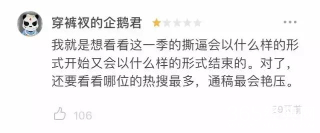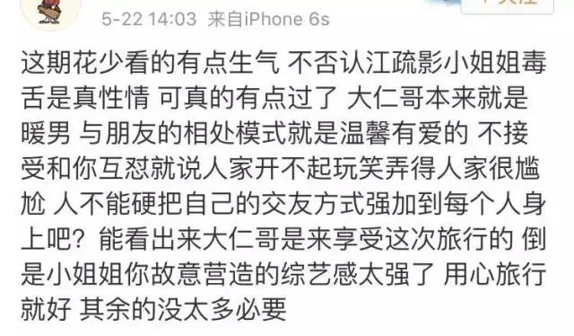 节目组内心os:想看撕x?没问题,大菜这就给您端上来。果不其然,昨晚第五期一播完,虽然收视率仍然虐心,但花少主演之一江疏影的微博中,已经出现了不少负面评论。