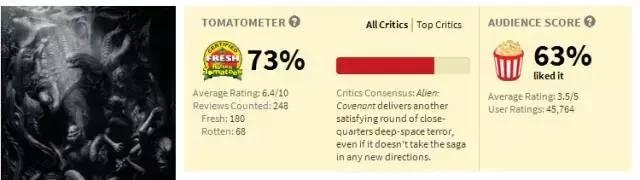 从目前的口碑来看, 《异形:契约》处于中等水平。烂番茄新鲜度73%,观众评分则只有63%。
