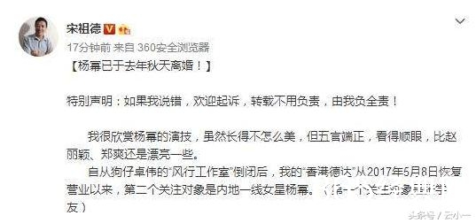 但今日,宋祖德又在微博里发表了头条文章,表示:杨幂已于去年秋天离婚!还在微博里特别声明:如果我说错,欢迎起诉,转载不用负责,由我负全责!