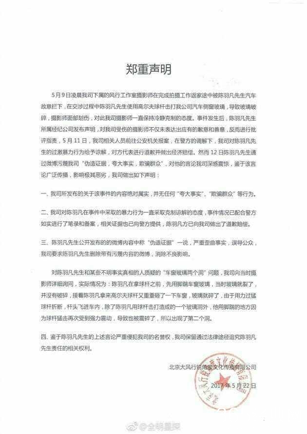 可能是陈羽凡对卓伟曝光白百何出轨而不满,心生怨念。所以那则“介于你等伪造证据,夸大事实,欺骗群众的行为,日后再遇,不管是豺还是狗.......”带有污蔑卓伟团队的微博一直没有删除。也就说明他不承认在派出所所作出的承诺!