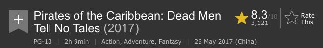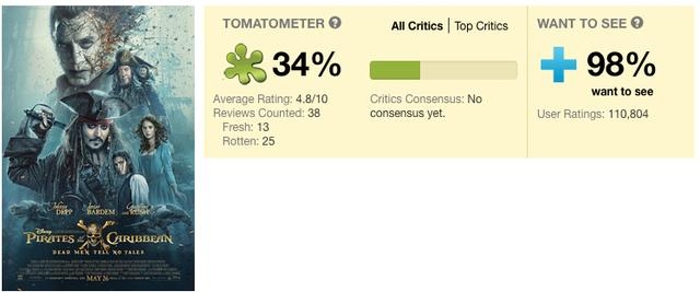 在烂番茄给出的38份评分中,有13人给出差评,新鲜度只有34%,10分的总分只有4.8分,在及格线以下,但影片的想看度高达98%,看来观众们对杰克船长的热情依旧不减。
