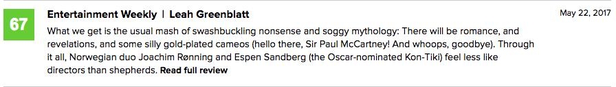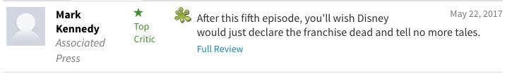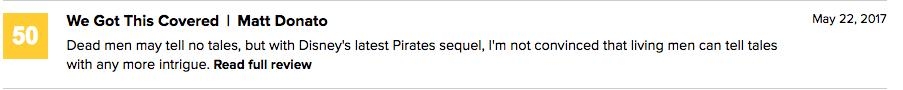 We Got This Covered则给出了中评:“死人可能讲不了故事了,但加勒比海盗5让我开始怀疑活人还能不能好好讲故事了。”