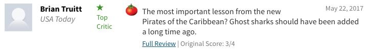 《今日美国》的影评人BrianTruitt给出了这样的评价:“从加勒比海盗5学到的最重要的一点是:早就应该在电影里加上幽灵鲨鱼了。”