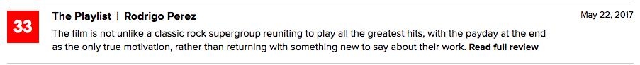 The Playlist给出了差评:“这部电影就像是一个经典摇滚组合开演唱会唱了他们所有的金曲,但只是为了赚养老金,而不是回归舞台给歌迷们带来他们新的动态。”
