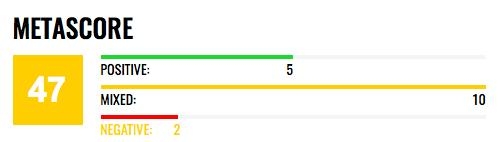 metacritic基于目前的19份评分得出了49分的分数,值得注意的是,其中有11个人给出了中评,说明电影还算无功无过。
