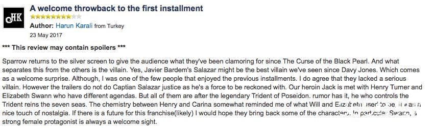加勒比海盗5的新反派——哈维尔·巴登饰演的萨拉查船长表现可圈可点,IMDb上一位资深用户称赞“哈维尔·巴登饰演的萨拉查船长可能是继戴维·琼斯以后最棒的反派了,”另外,“片中Henry和Carina之间的火花也让人想到当年Will和Elizabeth的曾经”(回忆杀啊朋友们!)。