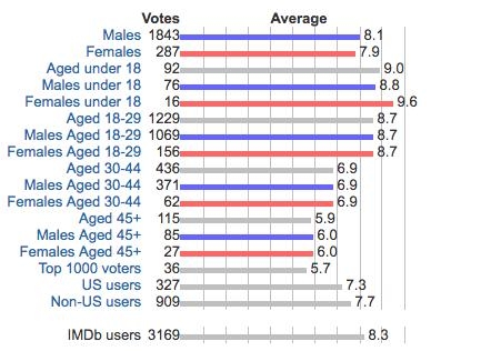 综上,IMDb的分数还是及格的,不过和专业性更强的烂番茄和metacritic相比,明显偏高。