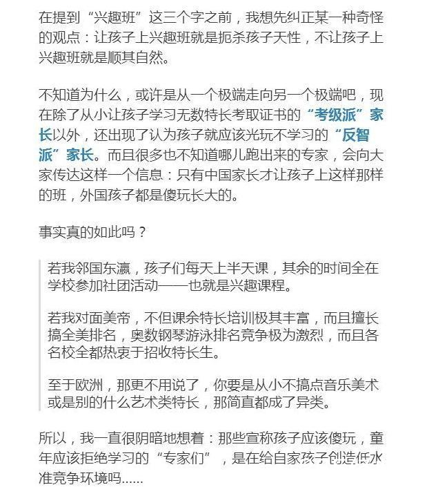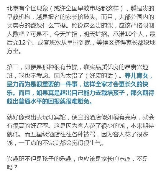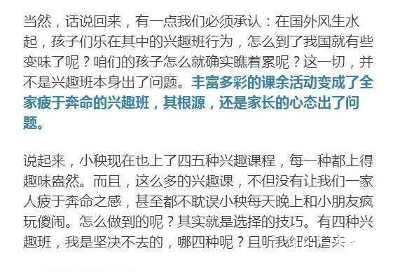 现如今,各种补习班众多,家长给孩子报补习班的时分简单盲目的挑选,我发现许多家长并不知道怎样帮孩子找喜好班,有种从众的心思,他人报哪里我就跟着报,现已疏忽了报喜好班的本来含义,上喜好班为了啥?是为了培育孩子的喜好协助开展,几乎就是在“害”孩子,给孩子带来无穷的压力。