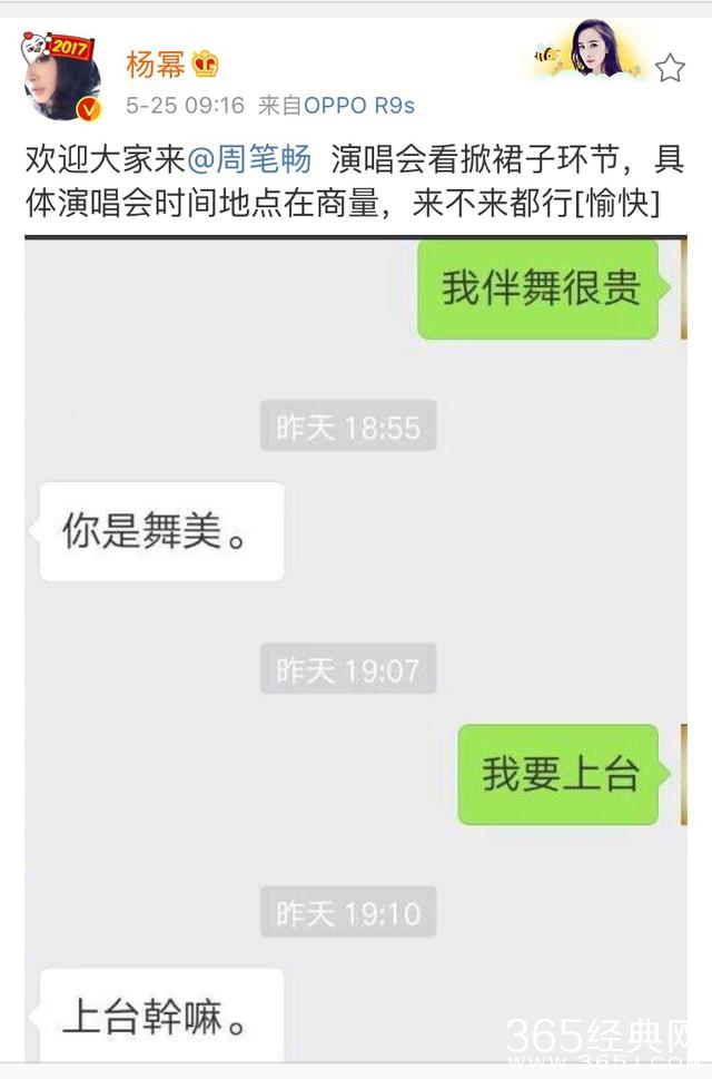今天杨幂也晒出和周笔畅的聊天记录,说的是周笔畅演唱会杨幂要去当嘉宾的事儿。这两人交流费劲,总是几分钟才回几个字,大概是两个人工作都太忙了,忙中偷闲聊微信,好家伙。