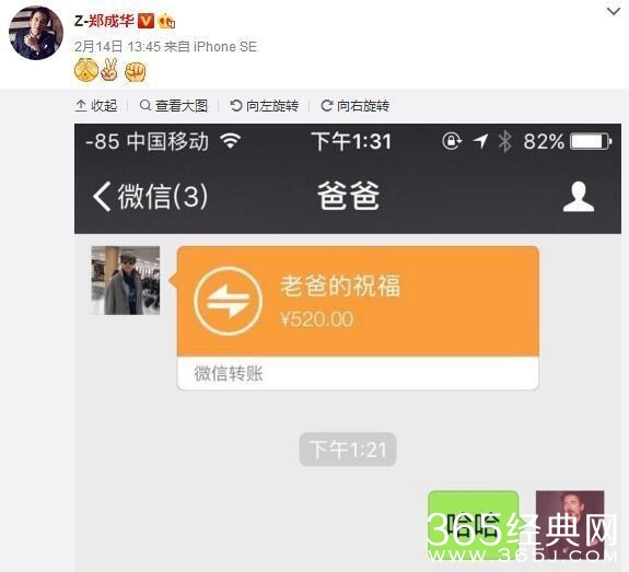 郑爽爸爸跟郑爽的聊天记录就比较简单,520发个520的红包,让你郑爽回个哈哈。没了!