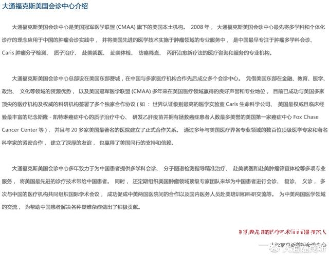 大通福克斯美国会诊中心(CMAA)是一家专注于为中国患者提供美国高端精准医疗咨询和服务的专业机构。