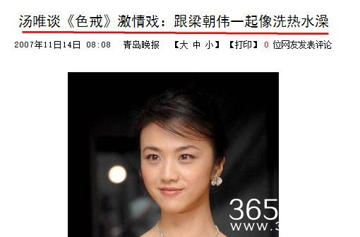 而汤唯也曾在节目中谈过拍摄这部片子幕后,说:很感谢导演李安和梁朝伟,并说,跟梁朝伟演激情戏就像洗澡一样。