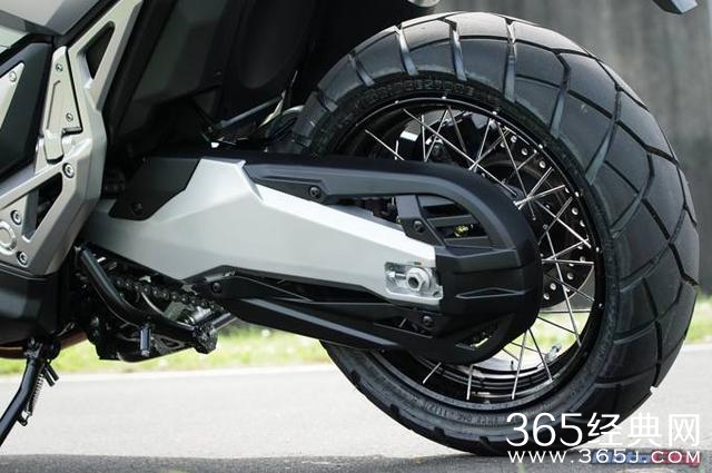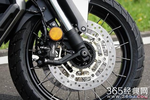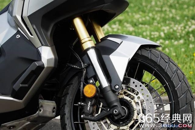 前悬挂采用41mm倒立前叉,行程153mm还具有回弹可调功能搭配前17寸无内胎钢丝轮毂和全地形轮胎,让X-ADV可以应付较恶劣的路况日规版的最低离地距为135mm欧规版的最低离地距为162mm