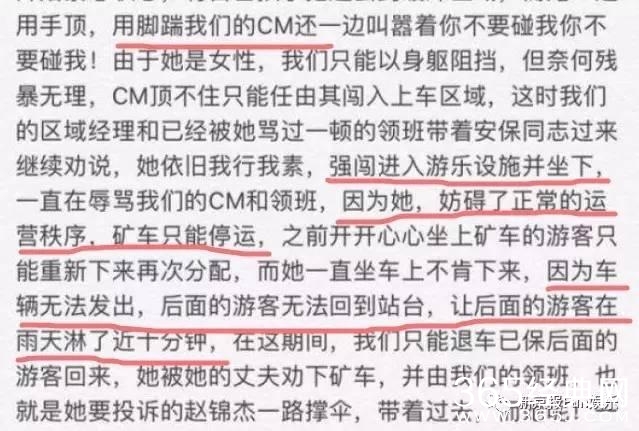 随后,有一位自称是事件当事人的迪士尼员工@呆萌的西瓜君 发长文表达对黄小蕾的不满,称对方“用脚踹CM”“强闯进入游乐车上不肯下来,导致其他游客无法回站台,其他游客淋了近十分钟雨”。