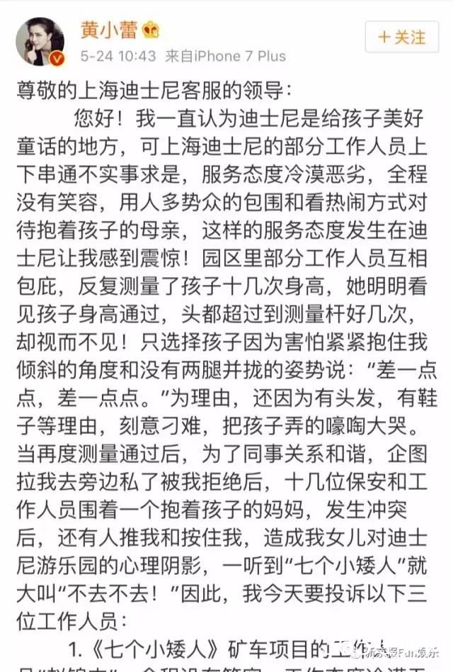 5月24日早7:30、10:43,黄小蕾在微博上连发两条长文投诉《七个小矮人》矿车项目的工作人员“服务态度差”“让孩子对迪士尼乐园留下了心理阴影”,以及控诉客服那要来的名片没有电话“投诉无门”,工作人员解释说:“老外喜欢发邮件。”