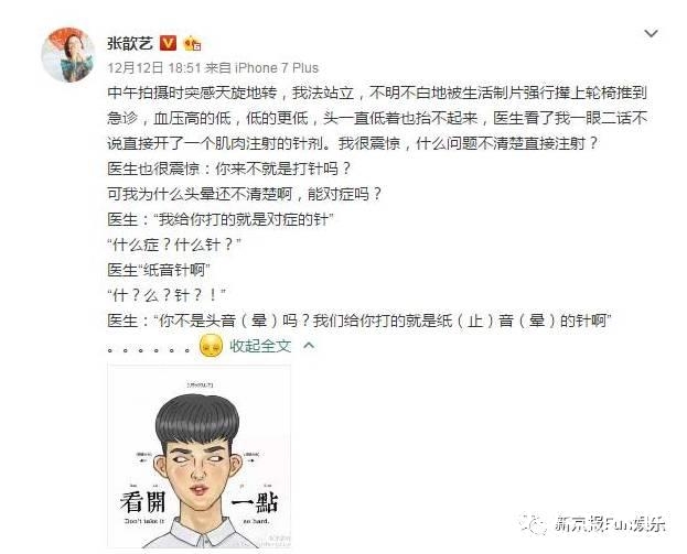 去年底,女星张歆艺发微博抱怨给她看病的医生态度不好,招来网民们的不满。张歆艺被指故意放大医患矛盾、嘲笑医生口音、不信任专业人士反而信自己上网搜,“作为公众人物,您说这样的话,真的让我们医护人员寒心”。