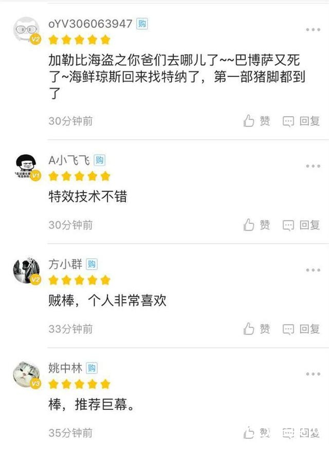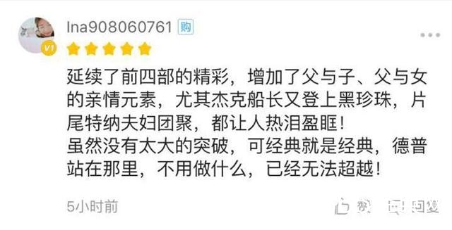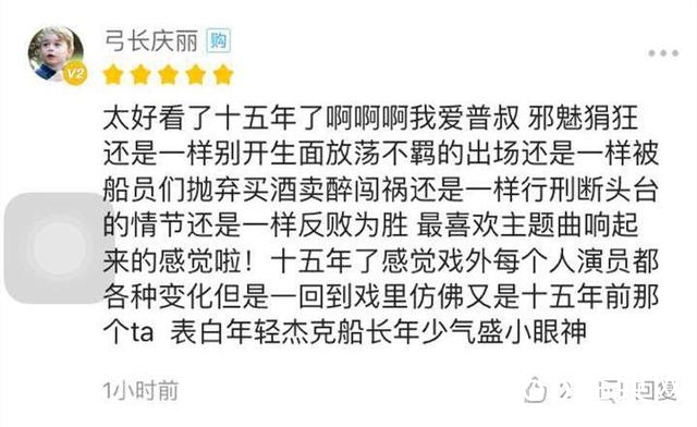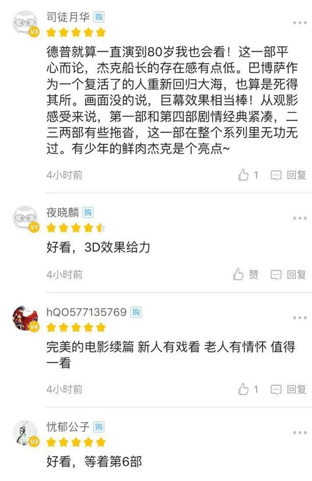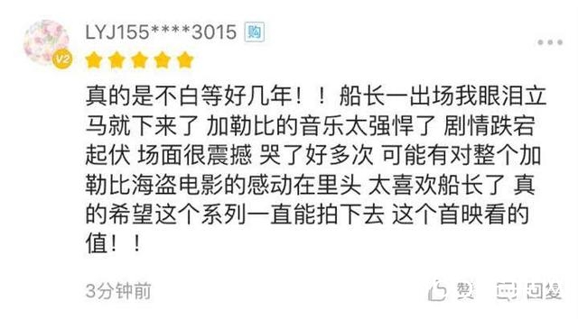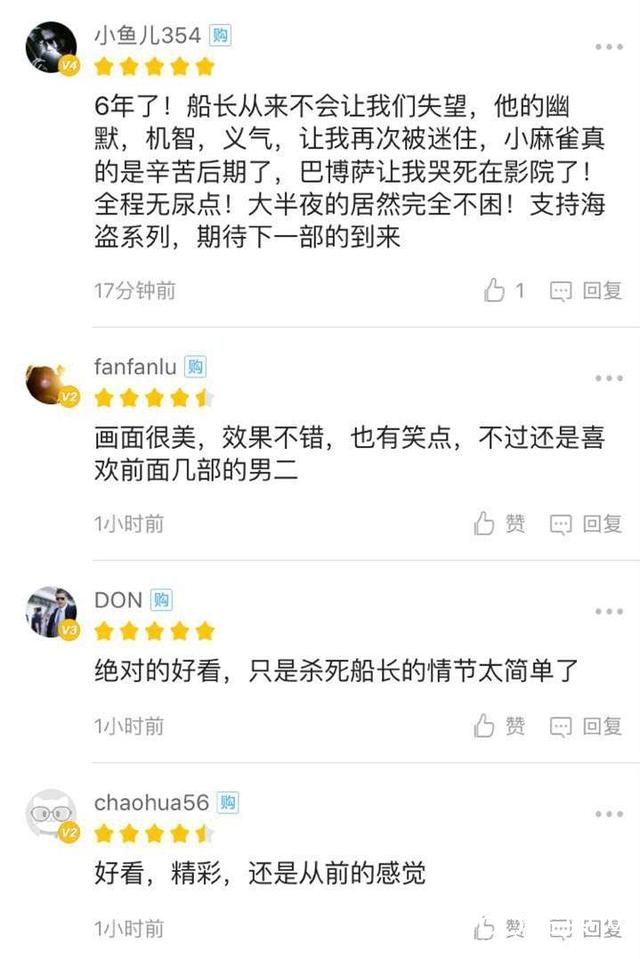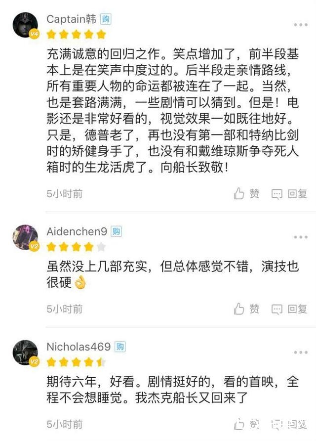 对很多影迷来讲,时隔6年回归的杰克船长自然引来了不少对《加勒比海盗》系列电影的情怀,给出电影好评的观众认为第5部特效精彩非常牛逼,大场面和动作戏都非常享受;系列演员回归也有了不少惊喜;电影延续了系列风格的搞笑和风趣,又不缺感动;剧情精彩紧凑不拖沓,自带BGM的德普仍将杰克船长演绎的生动精彩,回归之后就是一波团灭。