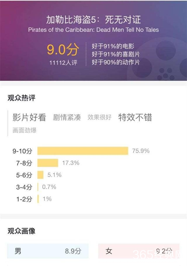 其中75.9%的观众给出电影9-10分的高分,17.3%的观众给出7-8分,而仅有1%的观众给出1-2分差评。在观众画像方面,女性观众均分9.2分高于男性观众8.9分。