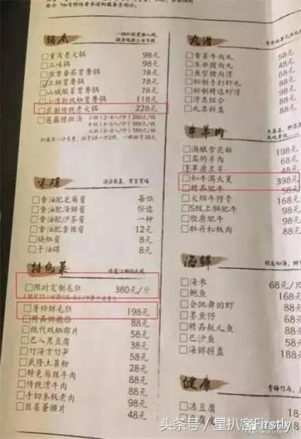 火锅店的部分菜价单曝光,一盘毛肚最贵198元、一份和牛满天星最贵398、虽说豆腐皮只要18块钱,还算可以,但吃过的吃瓜群众说一盘只有几片而已