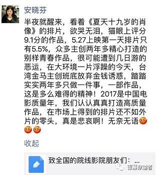 我是安晓芬,曾经制作出品发行了很多优秀的作品,如果爱,锦衣卫,叶问1、2,小时代1、2,钟馗伏魔,飞越老人院,人民的名义,夏天十九岁的肖像,目前为止,都赢得了非常好的口碑,在这个竞争非常激烈的行业里,我们扎扎实实做事,不靠天,不靠地,就靠自己带着团队一点一点打拼,这样认真做事的人和团队,真的不是很多了,夏天十九岁的肖像,是我们经过两年半的时间,精心打造的一部作品,目前猫眼评分9.1分,虽然期间经历了调档(因个别演员原因撤换演员重拍部分戏导致延期)、导致预算增加等等不可控因素,但是反而让我们更加精雕细琢,使作品更完美,两对年轻演员在片中也有出色表现,当下很火的前EXO成员黄子韬在片中更是意外惊喜,从哪方面说这都是一部好作品,但是这样一部作品,在第一天的排片,却只有5.5%,其他三部国产片荡寇风云,吃吃的爱,临时演员也不过是11%、8%左右,而加勒比海盗高达50.9%,这样巨大的差距,国产片真是死定了,给加勒比海盗降低一些排片,一点都不影响它的票房,而腾出的一点空间就给国产片一个生存机会,在此恳求院线影院的朋友们,多给国片一点空间,不要让国片死在起跑线上,拜托了!拜托了!安晓芬在此拜谢!