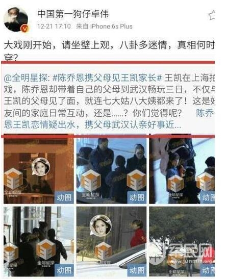 王凯在电影《铁道飞虎》上回应被卓伟曝光的“陈乔恩王凯父母见面” 。王凯:是这样,我在各种场合节目里一直在说,我和陈乔恩就个好朋友,纯粹好朋友的关系,这次陈乔恩去武汉之前有给我发过短信,没去过武汉,就带着父母去了,顺便看了我的父母,仅此而已,我父母只是尽了地主之谊。