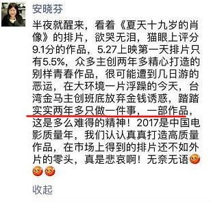 这部影片叫《夏天19岁的肖像》,由国内当红偶像黄子韬主演,可惜偶像名气再响。在好莱坞大片面前照样被打的满地找牙。上映首日排片只有可怜的5.5%。影片的制片人安晓芬急红了眼,又开始了求排片的套路。