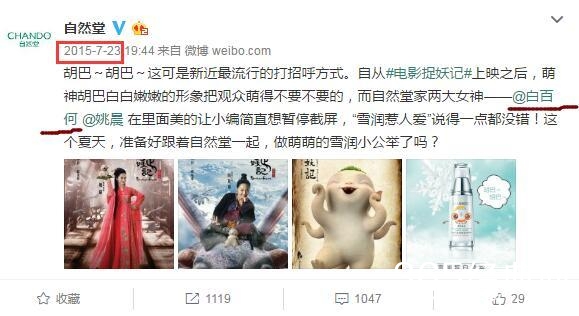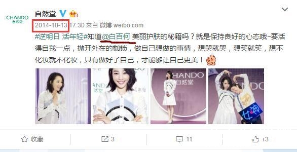 还有国内大品牌自然堂,翻看自然堂的官方微博可以看到,白百何可是在2014年和2015年连续两年接下了他们的代言。