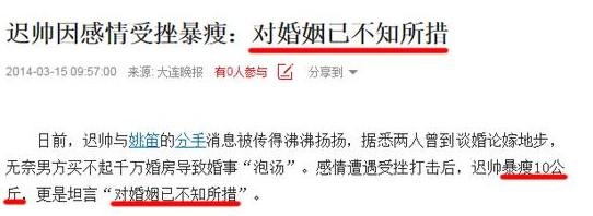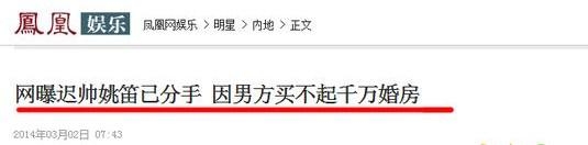 迟帅跟姚笛在交往期间还是很甜蜜的,一起吃火锅,一起旅游等,就当大家纷纷猜测两人好事将近的时候,他俩却宣布分手,至于原因,知情人透露是姚笛的父母太爱钱,要求迟帅买房,而当时的迟帅还没有能力买得起千万的婚房。在丈母娘的阻扰之下,无奈结束7年恋情。