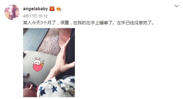 自从升级当妈后,Angelababy尽显母爱,4月17日她曾在微博晒出小海绵在手上睡着的照片,并发文:“某人今天3个月了,很重,在我的左手上睡着了。左手已经没感觉了。”可见对小海绵有多么宠爱。