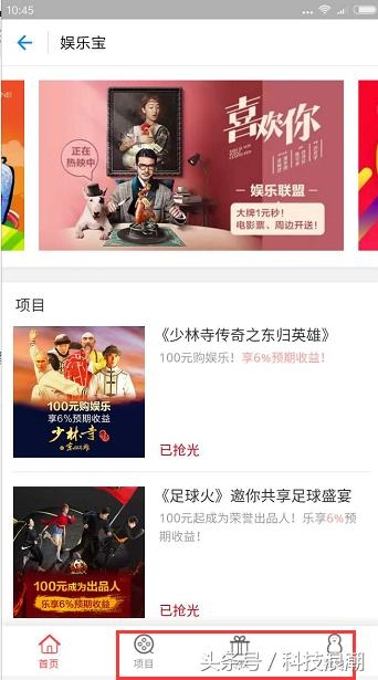 2、在娱乐宝页面有项目和特权等多个选项,参加投资就能取得影视剧作品的收益分成。
