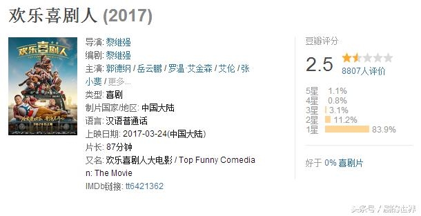 本以为刘德华的《富春山居图》的2.9分要“名垂青史”了,没想到半路杀出一个《欢乐喜剧人》,这部电影集齐了郭德纲、岳云鹏、艾伦、潘斌龙、张小斐等众多知名的喜剧人,心疼憨豆先生3秒。长这么大看过最烂的,分分钟刷新底线。