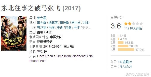 这部电影由贾乃亮、马丽、王迅等主演,也是喜剧片,虽说有喜剧演员,但是一点也不好笑,演技浮夸,观众表示有些电影是圈钱,这部电影直接是来骗钱的,东北人如果看了估计要骂娘了,3.6分都有点高了。