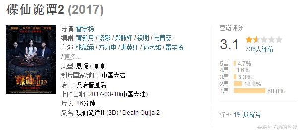 第一部《碟仙诡谭》是在2014年拍的,豆瓣评分3.0分,不知道导演哪里来的勇气拍第二部。这部电影也没有多大的影响力,炮灰一枚。