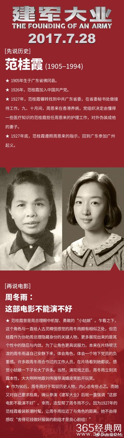 周冬雨在此次电影《建军大业》中饰演范 桂 霞,再次凭借高超的演技突破了自我,展现出与以往全然不同的稳重感。这个历史上在周 恩 来总理眼里是机智勇敢的小姑娘,却也有着隐忍内敛的一面,为了表现出革命者的沉稳大气,周冬雨一改在片场活泼的性格,努力让自己冷静和沉淀,拍完这场戏,合作过周冬雨的工作人员都觉得她甚至长大了不少。