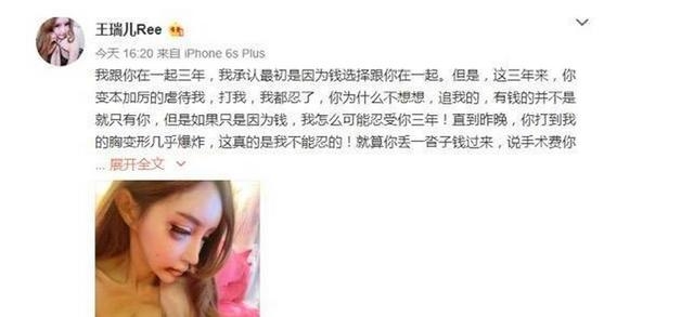 当初跟他在一起一开始是因为钱,可是后来想好好过了,却不曾想三番五次被家暴,打得鼻青脸肿,甚至自己整形的胸部也被打得惨不忍睹,后来为了自身的安全着想,果段分手了,没想到前男友好手段,找了个知名女星上位,最后却是以这样的结局收尾,还在微博发声:人贱自有天收!