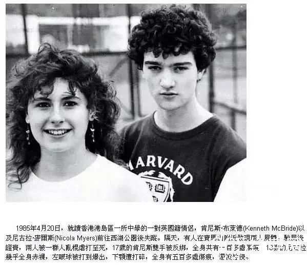 1985年4月20日,香港岛港岛中学的一对英国籍情侣:Kenneth McBride及Nicola Myers在前往香港岛北角的赛西湖公园之后失踪。翌日,有晨运客在北角宝马山配水库附近发现两人尸体。