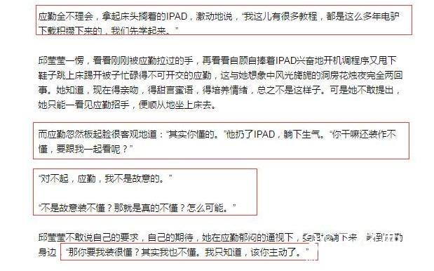 在小说中,婚后一直有夫妻生活的冲动,但无奈有家里还有其他人,很不好意思,终于,两人可以独处,应勤兴致勃勃,还拿出ipad说要学习收藏起来的教程,邱莹莹略显尴尬,明知程序不对,但又不好点破,但这是应勤的直男癌又犯了。