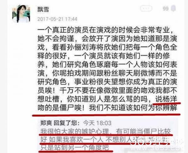 相信细心的观众已经发现了,郑爽在拍《微微一笑很倾城》的时候,因为拍吻戏不张嘴,被网友指责不够投入,其实追剧的观众会发现,杨洋和郑爽的吻戏虽然看上去很甜,但是两人配合度似乎不是很高,杨洋吻得很投入很认真,而郑爽有点拘束不说,在最后红嫁衣激吻那段,郑爽看上去很没有如此,就连嘴巴都没有长开,还被网友直接吐槽“杨洋好像在演一根木头”。
