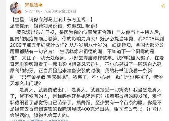 5月27日早上,“大嘴”宋祖德在微博怒斥金星:“金星,请你立刻马上滚出东方卫视!”宋祖德直言侮辱金星“搞舞蹈,至少要有一个苗条的腰,你是不是经常去香港谢霆锋的锋味饼屋吃400克米田共,腰才这么夸张,旗袍也会说话的,旗袍也会骂人的。”火影忍者剧情介绍