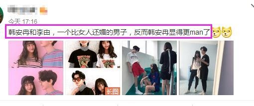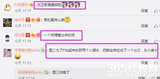 还有网友看照说:反正都是整容脸,一个师傅整出来的吧!图二为了P站起来的那两个人腿长,把韩安冉拉成了一个壮汉,头小身大!