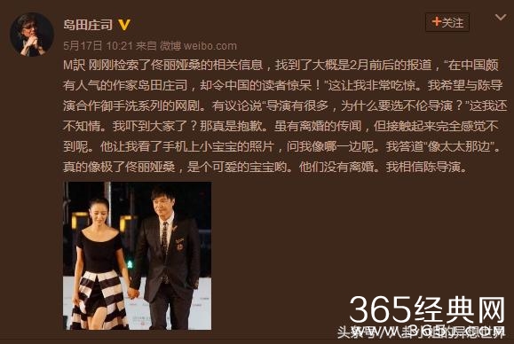 MISS八卦上一次看到日本推理小说大神岛田庄司的消息是在5月中,当时他在微博上PO出陈思诚和佟丽娅的合影称两人并没有离婚,并写道:“我相信陈导演。”于是,毫无悬念的,他被网友们狠怼了。