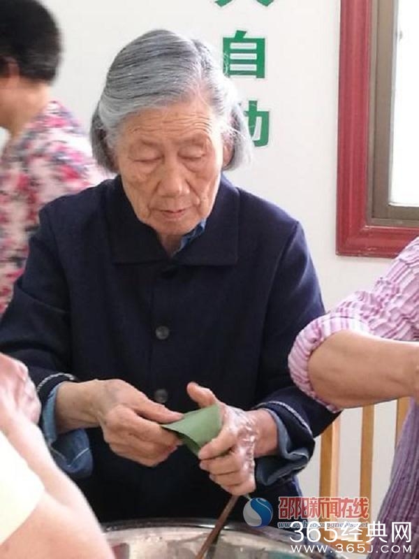 92岁的陈容华老人展示包粽子手艺。